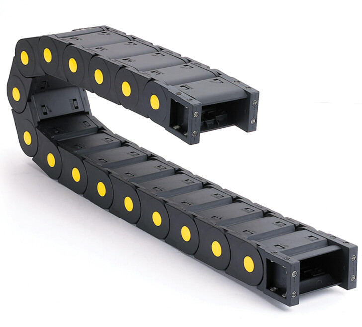 2、鋼鋁拖鏈每節都能打開,便于安裝和維修。運動時噪音低、耐磨、可高速運動。